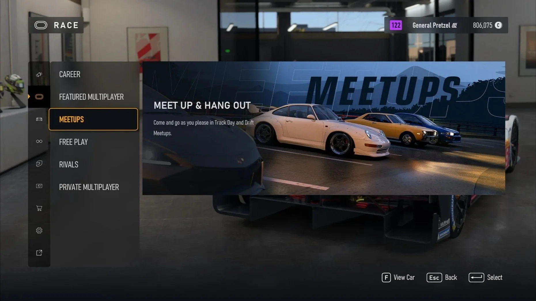Meetups is a multiplayer feature that allows players to join an open lobby on-track with a number of other players. Players are free to utilize whatever car they want and can vote to change tracks at any time. There are two core Meetup types - Drift Meetups, in which Drift scoring is enabled, and Track Day Meetups in which normal laptime scoring is in effect.
